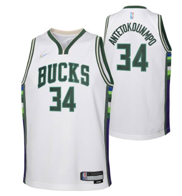 Nike Youth 2021 22 City Edition Milwaukee Bucks Giannis Antetokounmpo 34 White Swingman Jersey Dick S Sporting Goods
